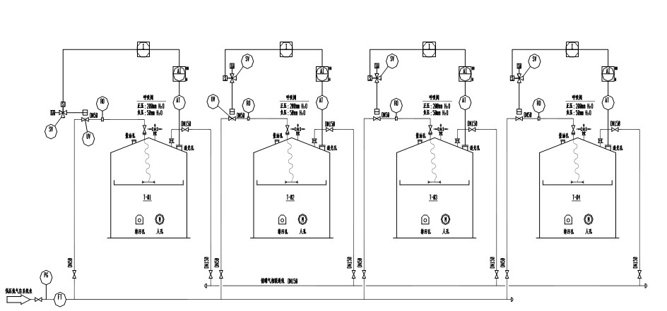 1)在每台储罐上设置先导式氮封阀组和限流孔板旁路,正常情况下使用氮封阀组维持罐内气相空间压力在1.2KPa左右,当气相空间压力高于1.4KPa时,氮封阀关闭,停止氮气供应;当气相空