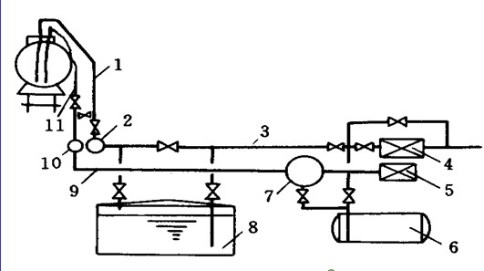 1-鹤管;2-集油管;3-输油管;4-输油泵;5-真空泵;6-放空罐;7-真空罐;8-零位油罐;9-真空管;10-扫舱总管;11-扫舱短管