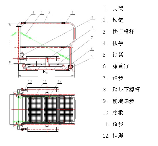 活动梯的主要结构由踏步、扶手、弹簧缸平衡系统,锁紧机构等组成, 主要结构图如下图所示: