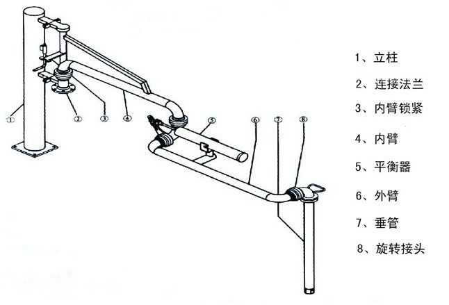(2)产品出厂时已做密封性试验,用户安装时只需参照结构示意图,先将水平短管与发油台上基础法兰连接好,然后连接水平短管与升降臂组,最后安装平衡器,连接平衡器拉杆。
